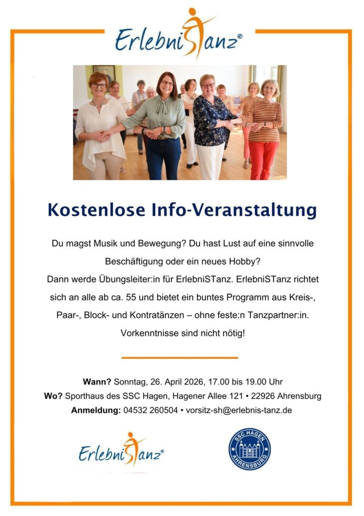 Du liebst Musik, Bewegung und Menschen? Dann entdecke ErlebniSTanz – ein Angebot, das Körper, Geist und Seele in Schwung bringt. Finde heraus, wie du als Übungsleiter:in Senior:innen Lebensfreude, Fitness und Gemeinschaft schenkst. Wenn du mehr dazu erfahren möchtest, komm zur kostenlosen Info-Veranstaltung beim SSC Hagen!