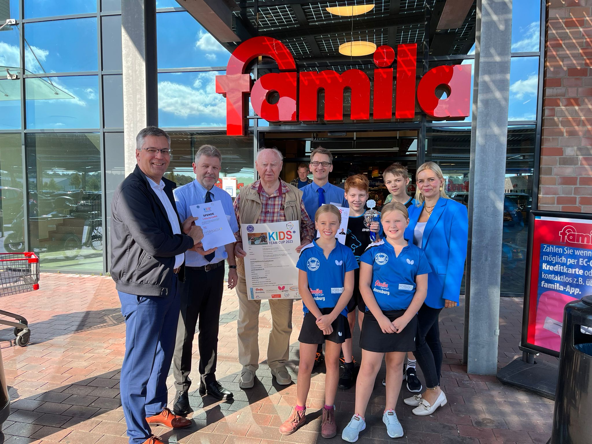Der „Kids Team Cup 2023“ hat nicht nur für eine Rekordsumme an Preisen gesorgt (ca. 1.800,00 Euro), sondern auch für eine Rekordspende an den Deutschen Kinderschutzbund e.V. Stormarn in Höhe von 1.650,00 Euro. Die Spende wurde überreicht bei Famila Ahrensburg, die den Tischtennis-Tisch als Hauptpreis für die Verlosung gespendet haben, sondern auch die Lebensmittel zur Verfügung gestellt haben, die beim Turnier verköstigt wurden. Startgelder und Spenden am Turniertag sowie Spenden von Teilnehmer*innen des Turniers sorgten für diese Rekordspende. Mit diesem Betrag – so Oliver Ruddigkeit, neuer Geschäftsführer des DKSB – werden Spielsachen des Kinderhauses Blauer Elefant gekauft sowie Familien in Not in Ahrensburg unterstützt. Famila Ahrensburg-Boss Hans-Jürgen Studt hat spontan zugesagt auch 2024 wieder beim „Kids Team Cup“ als Hauptsponsor dabei zu sein. Vielen Dank an die Sponsoren des Turniers, die die Kosten des Turniers finanziert haben und besonderen Dank an die Helfer Karin und Reinhold Schulz, sowie die Familien Franziska und Timo Schmidt sowie Susanne Schubert, die mit dem Sponsor TARGOBANK ein bei allen Teilnehmer*innen beliebtes Glücksrad erstmalig präsentiert hat.