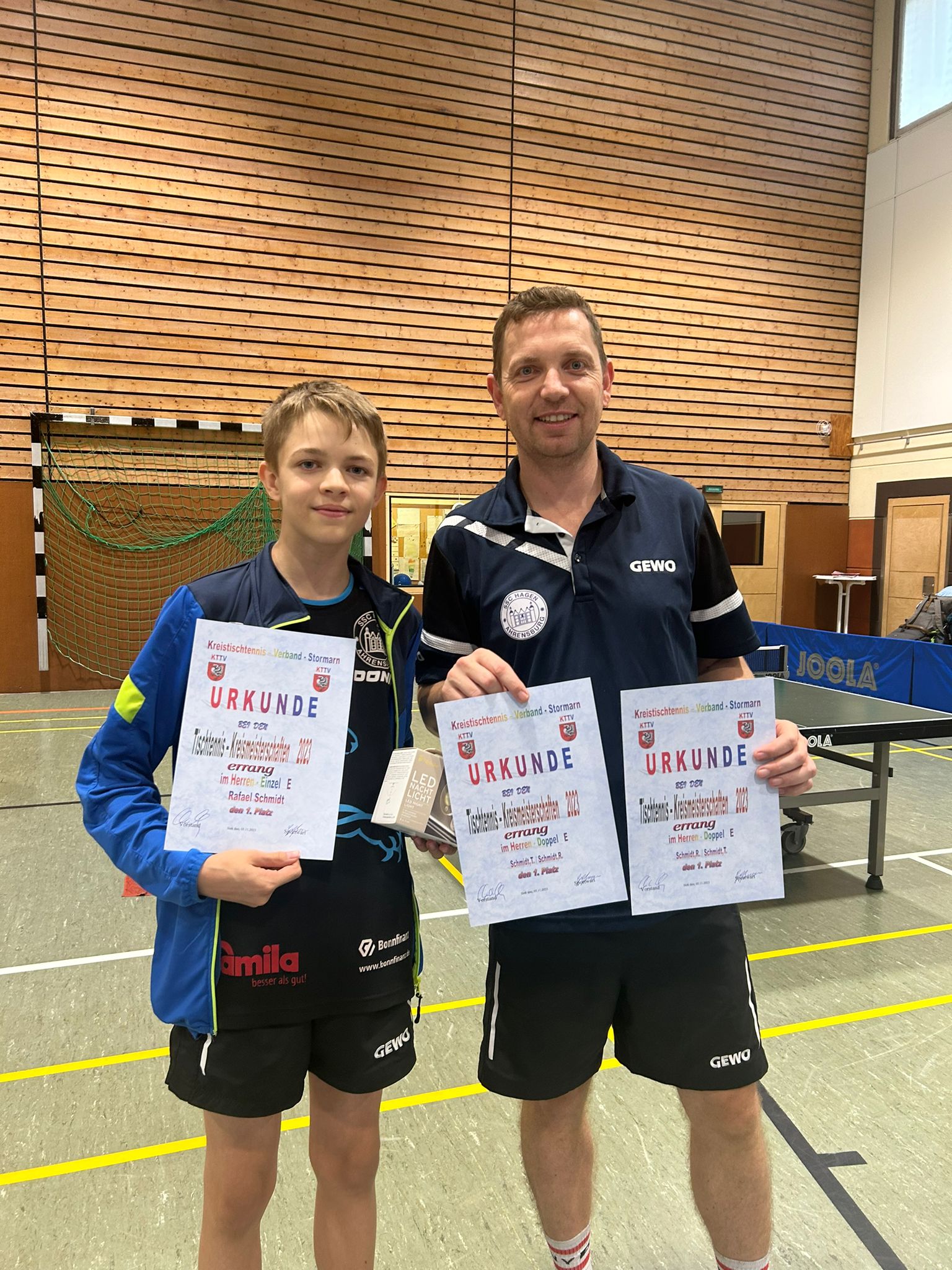 Rafael Schmidt (Jungen Bezirksliga U19) und sein Vater Timo gewinnen die Doppelkonkurrenz.
