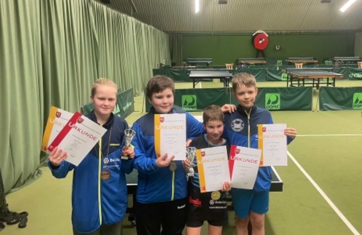 Faszinierend die Endspiele im Doppel und im Einzel. Im Doppel sorgen Rafael Schmidt und Nick Pokrantz mit einer überragenden Leistung mit einem 3:0 für klare Verhältnisse und nehmen mit geschickter Taktik Maarten Maurer vom TSV Lütjensee (Mitglied im TTVSH-Landeskader) aus dem Spiel. Faszinierend die Leistung von Max Gröh und Bjarne Elias Jansen(Foto v.l.n.r: Max, Bjarne, Nick, Rafael): dazu Andreas Gröh: