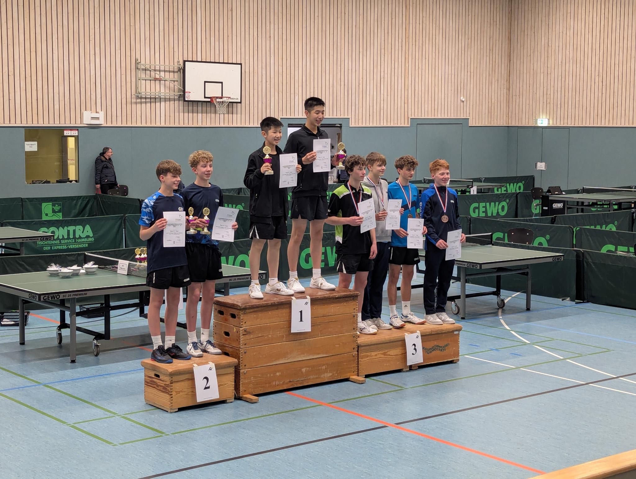 Hannes belegte den 3. Platz im Einzel und qualifizierte sich für die Norddeutschen Meisterschaften, Rafael Schmidt schied leider im Achtelfinale im Einzel aus, belegte mit seinem Partner Johan Wolff vom SuS Waldenau im Doppel einen hervorragenden 3. Platz. Hannes Schubert und sein Doppelpartner Enno Mücke vom TSV Schwarzenbek belegten im Doppel einen hervorragenden 3. Platz. Glückwunsch, Jungs.